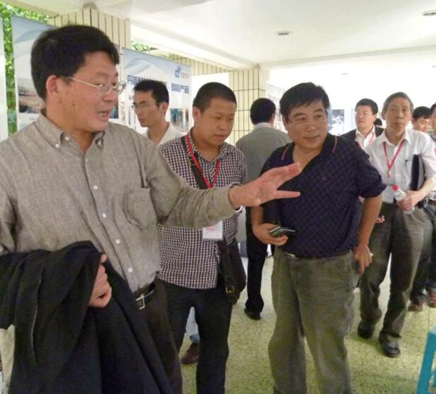 佟建國總工程師向歐進萍院士介紹公司在加固改造和減震技術上的成果