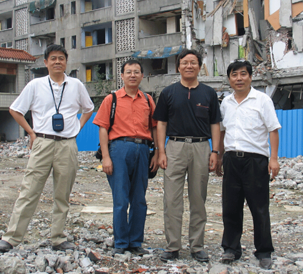 佟建國總工程師陪同著名建筑抗震學家呂西林教授、著名建筑抗震學家翁大根教授在災區考...